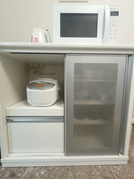 冷蔵庫1台、IHコンロ3口、電子レンジ1台、トースター1台、炊飯器1台、ポット1台、